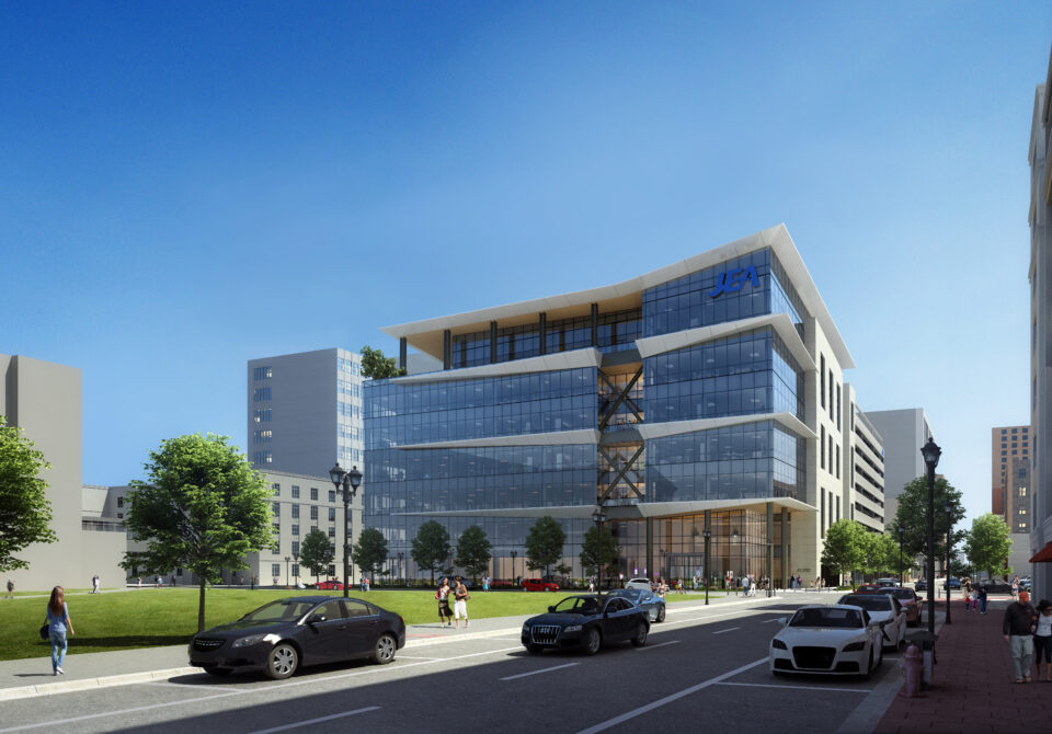 The new JEA headquarters is planned for LEED-gold certification and features multiple workspaces, open, flexible floorplates, and access to outdoor spaces affording views of the Duval County Courthouse lawn, the St. John’s River, and historic James Weldon Johnson Park.
